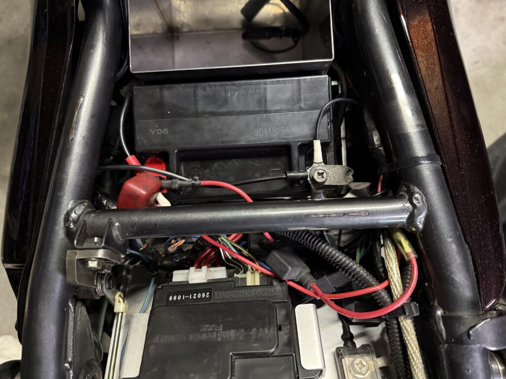 ゼファー750はシート下にバッテリーがあるので、まずはシートを取り外し。 - マイナス端子 → プラス端子の順に外す